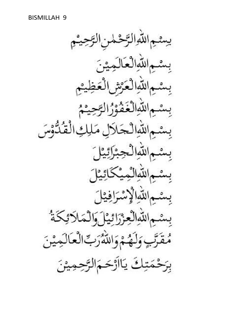 Bismillah 5 , 6 ,7, 9 & 20 bismillah enam [dengan bacaan rumi. Ayat 'bismillah 7' ini juga sesuai dijadikan sebagai ayat syifa ataupun penawar tatkala ditimpa sesuatu musibah ataupun penyakit. Fadhilat ayat 'bismillah 9' ini amat besar sekiranya diamalkan setiap kali selepas solat: · memagari diri dari segala jenis . Khasiat bismillah 9 · jika dibaca setiap selesai sholat fardhu, maka allah swt akan menuntaskan segala hajat dan keinginannya. Apa pun juga kelebihan dan .
